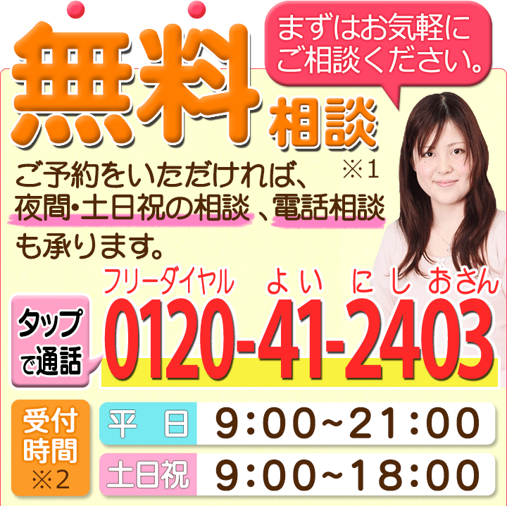 トップ共通バナー元※消さない 階層構造▼ 共通バナー元※消さない 受付時間 平日 9時~21時、土日祝 9時~18時 夜間・土日祝の相談も対応します (要予約) 0120-41-2403 お問合せ・アクセス・地図